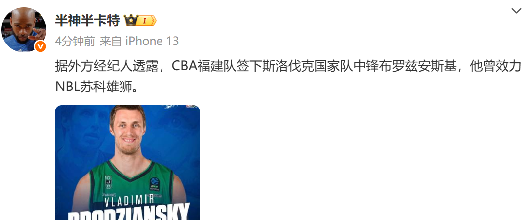6686体育平台11月5日讯 据国内媒体人“半神半卡特”报道,据外方经纪人透露,CBA福建队签下斯洛伐克国家队五号位布罗兹安斯基,他曾效力NBL苏科雄狮。