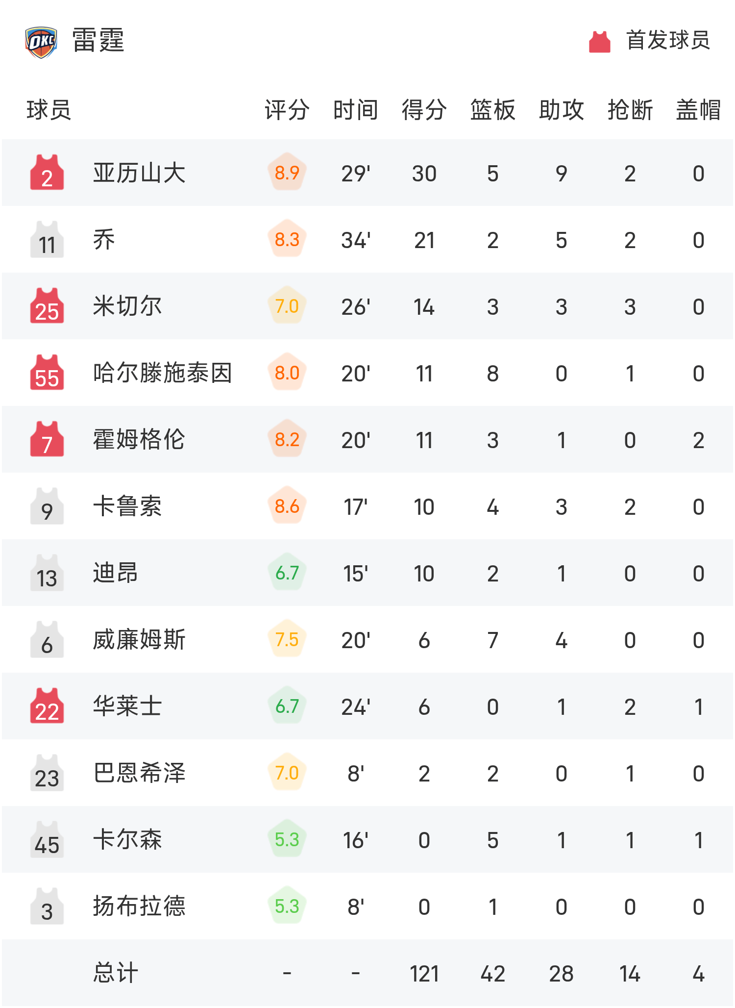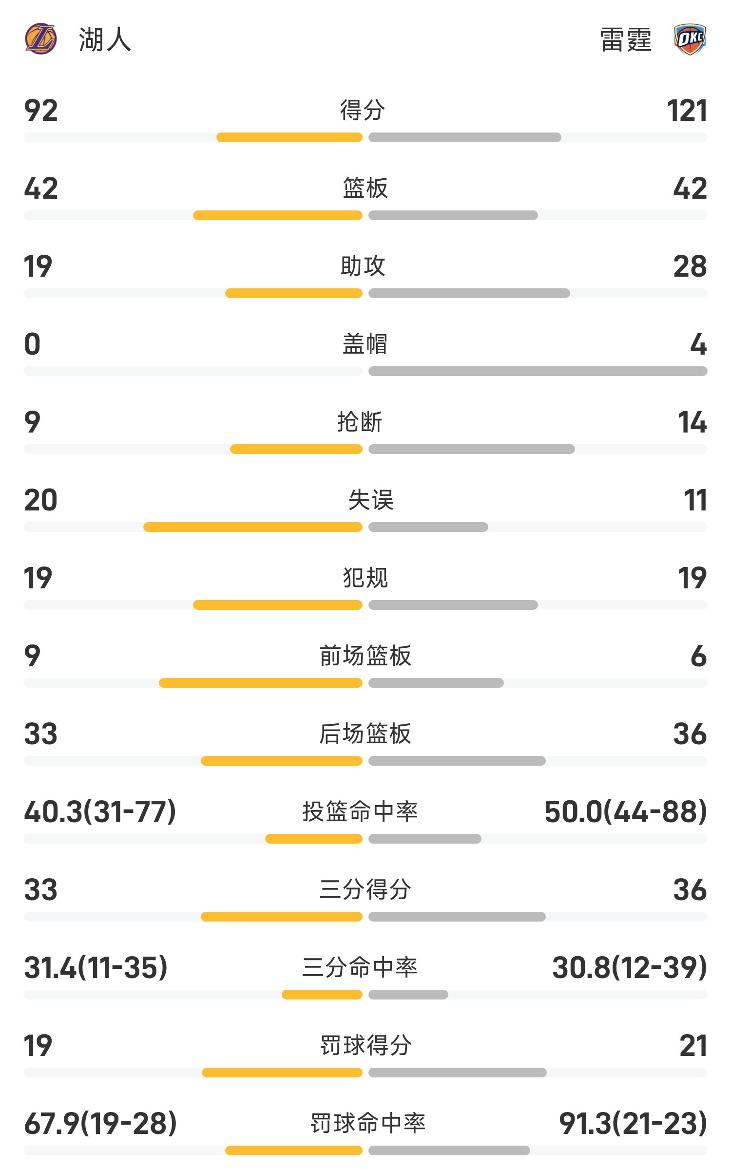 NBA战报:亚历山大30分9助,雷霆121-92大胜湖人