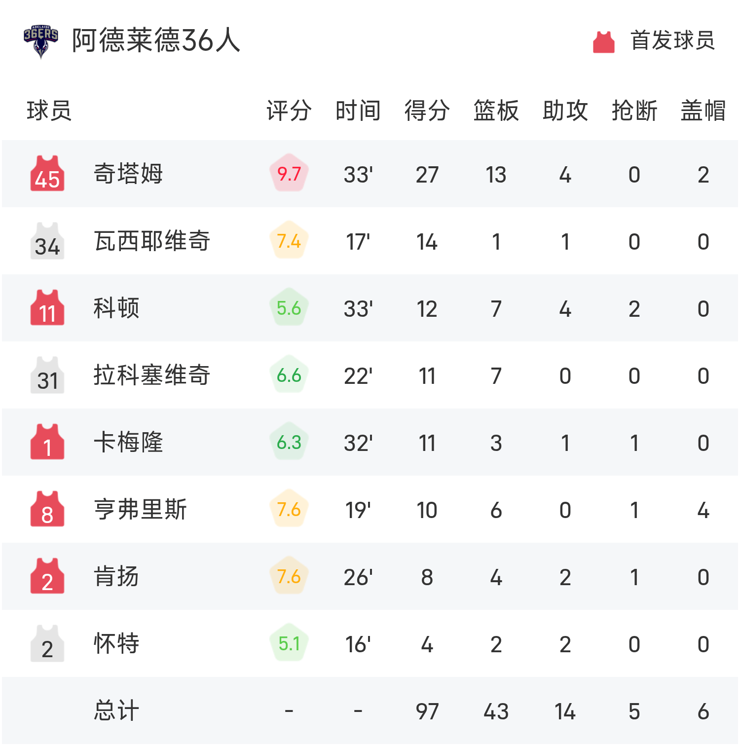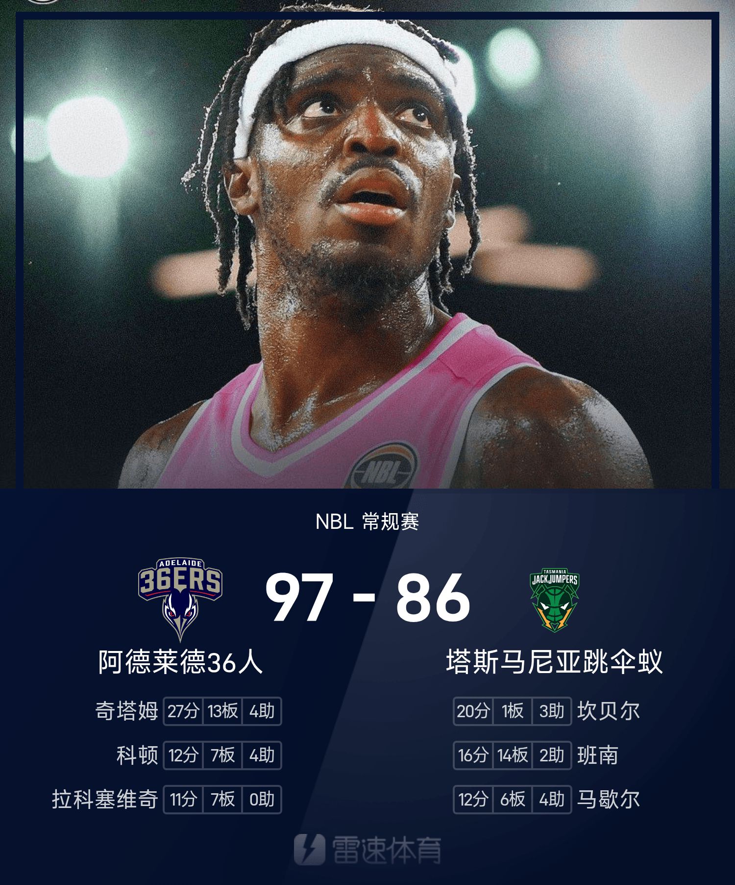 奇塔姆砍下全场最高的27分13板4助,率领阿德莱德36人胜利取胜。