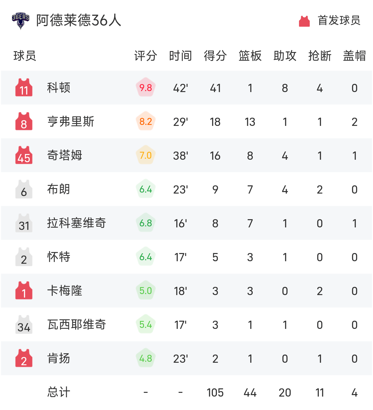 科顿砍下全场最高的41分1板8助,率领阿德莱德36人胜利取胜。
