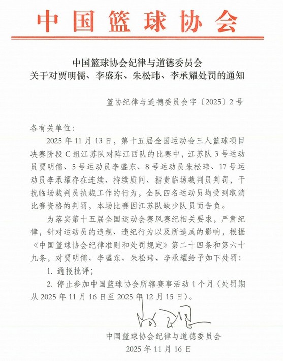 6686体育平台11月16日讯 中国篮球协会纪律与道德委员会官方宣布,给予全运会三人篮球项目江苏队队员贾明儒、李盛东、朱松玮和李承耀通报批评和停顿参加中国篮协所辖赛会活动1个月的处罚,原因是他们四人存在连续、持续质问、指责临场裁判员员裁决、干扰临场裁判员员执裁工作的行为。公告原文如下: