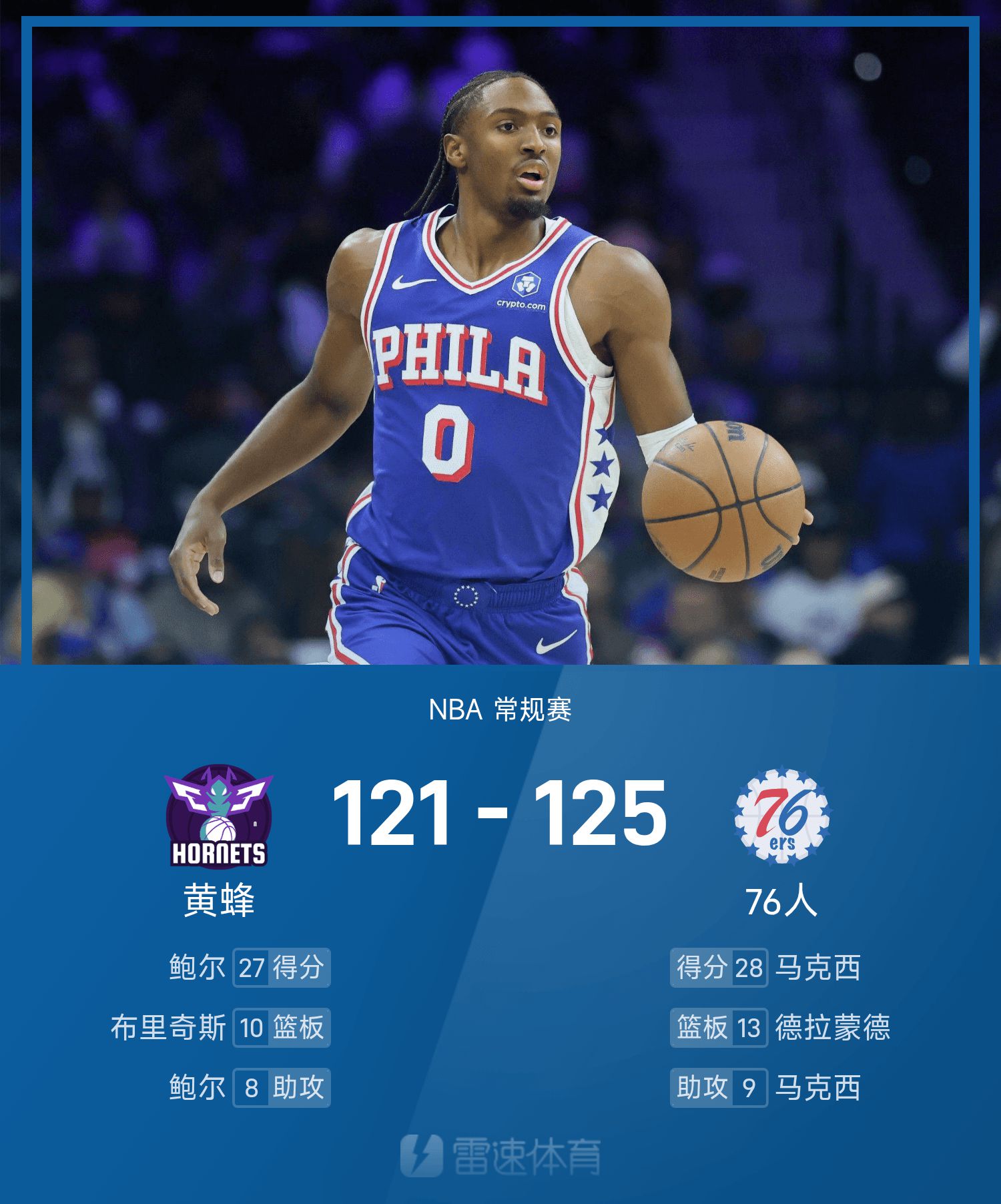 NBA战报:马克西28分9助,76人125-121险胜黄蜂