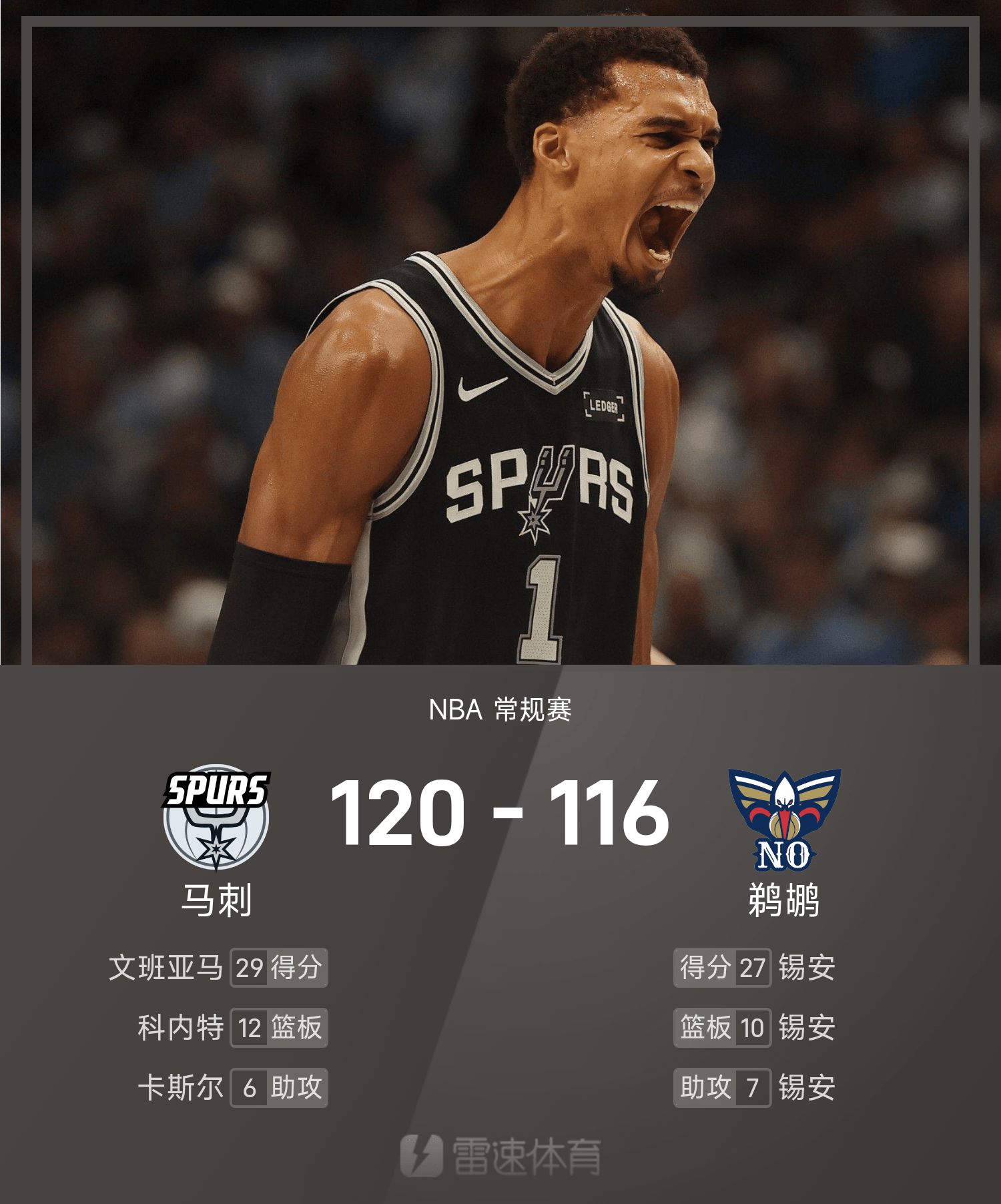 文班亚马23投13中,得到29分11抢篮板2助攻9封盖。