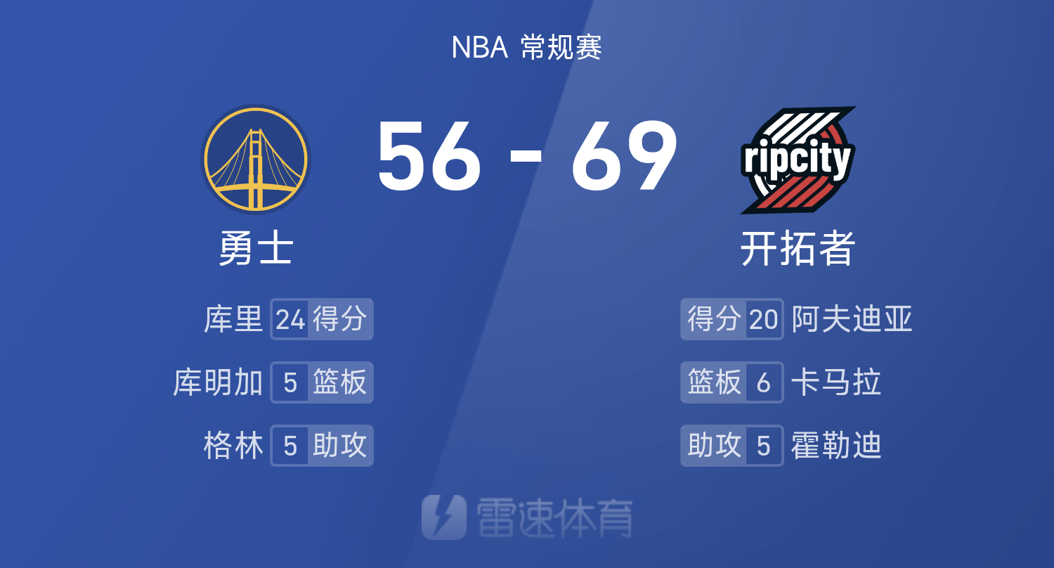 NBA半场:杨瀚森1投0中得到1抢篮板1差错,库里5记三分球狂轰24分,开拓者69-56勇士