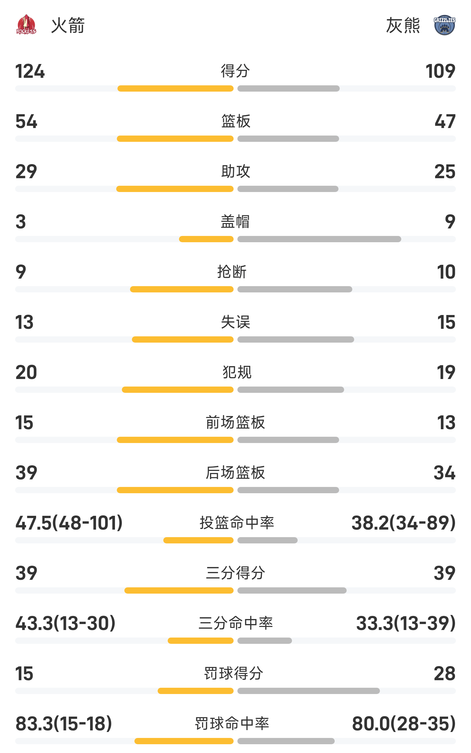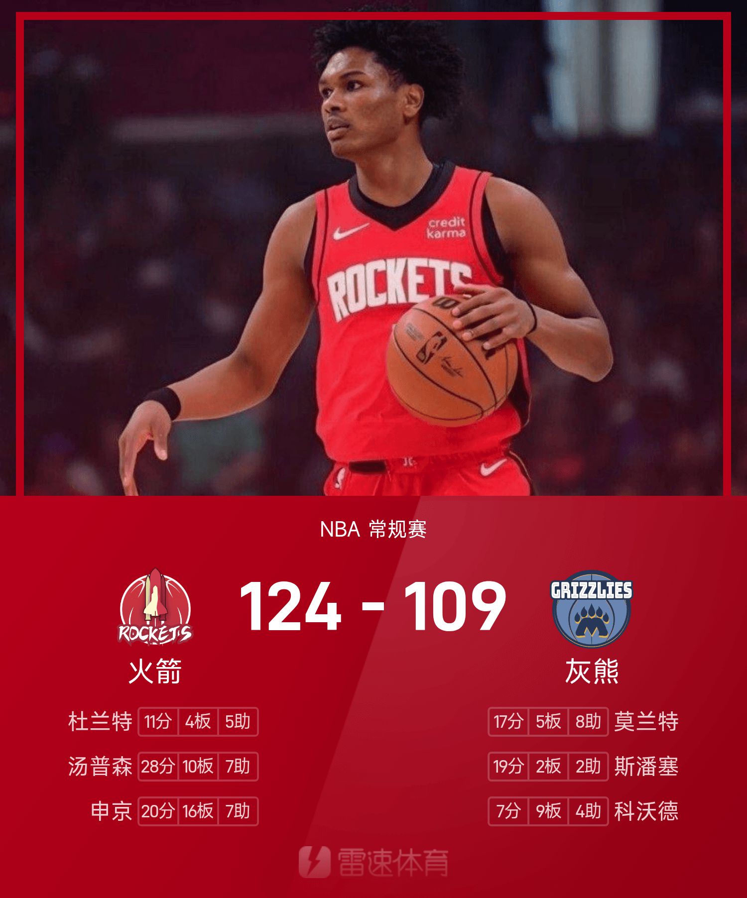 6686体育平台11月06日讯 25/26赛季NBA 常规赛,灰熊对阵火箭。双方全场战罢,灰熊109-124不敌火箭。阿门·汤普森砍下全场最高的28分10板7助,率领火箭胜利取胜。