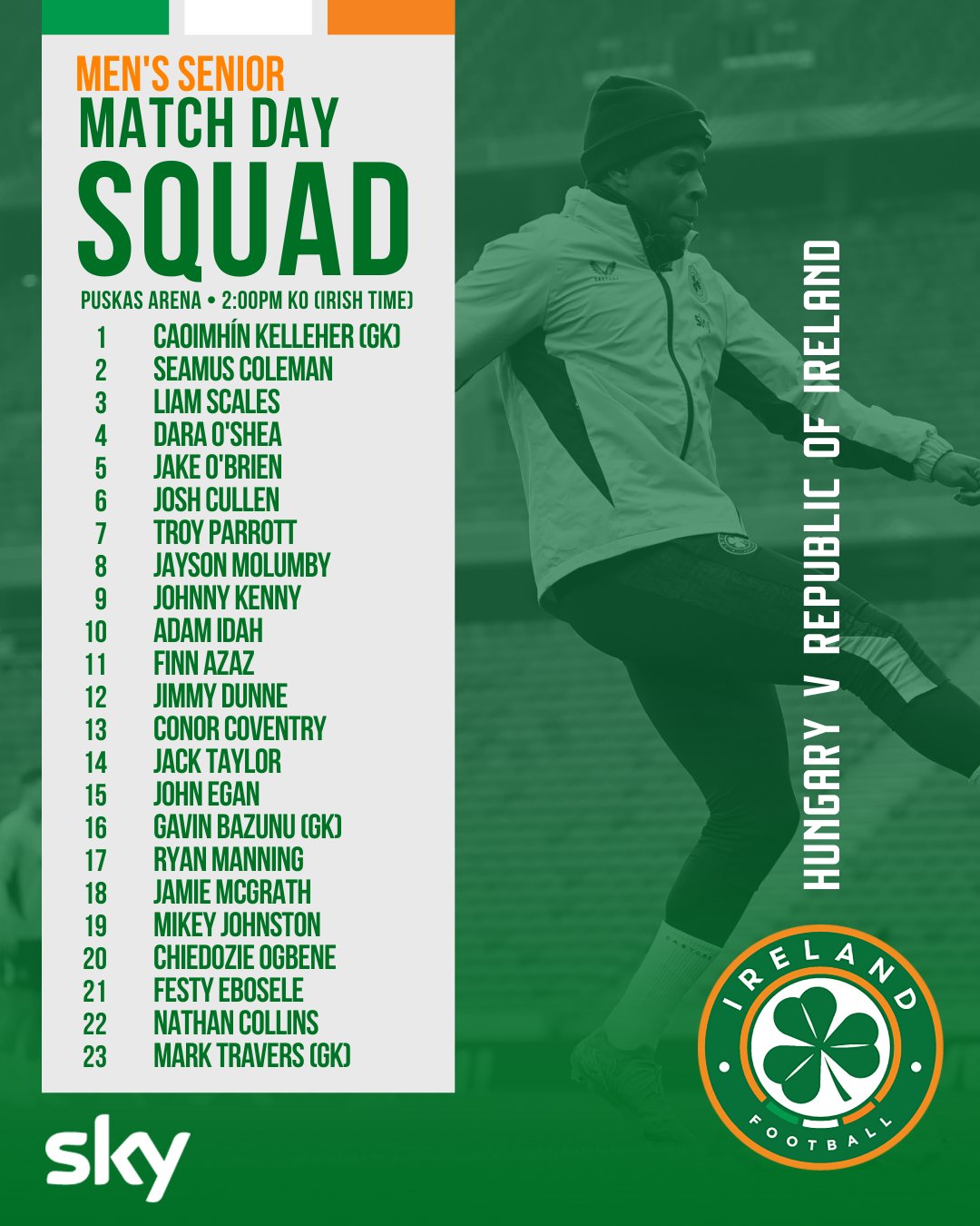6686体育平台11月16日讯 今晚世欧预分组赛F组,爱尔兰客队场挑战匈牙利。赛前,爱尔兰队官方社媒发布本轮大名单: