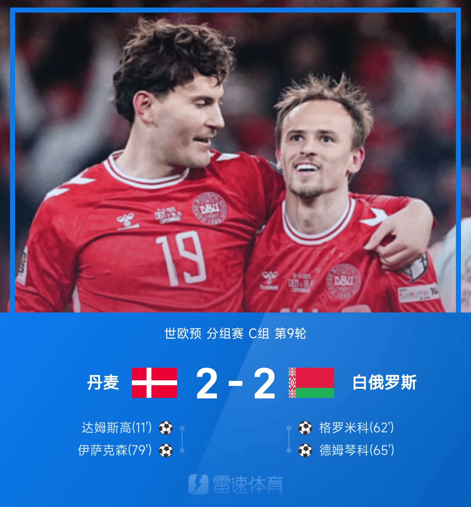 世欧预战报:伊萨克森破门救主,丹麦2-2白俄罗斯