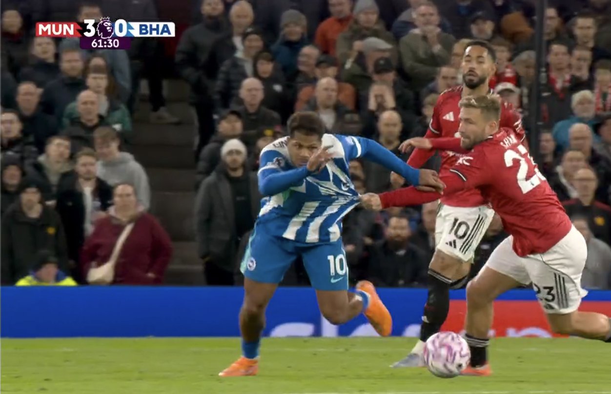 6686体育平台10月26日讯 英超联赛事第9轮,曼联主队场对阵布莱顿的下半场竞赛第61分钟,卢克·肖守卫中拉拽布莱顿攻击手吕特致其倒地,随后曼联反击取得进球,3-0领跑位。主裁判判安东尼·泰勒拒绝吹罚卢克·肖此前的守卫违例。