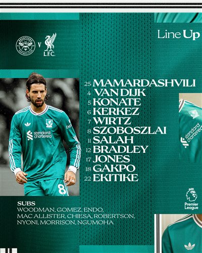 利物浦客战布伦特福德:维尔茨、埃基蒂克首发,萨拉赫持续出战