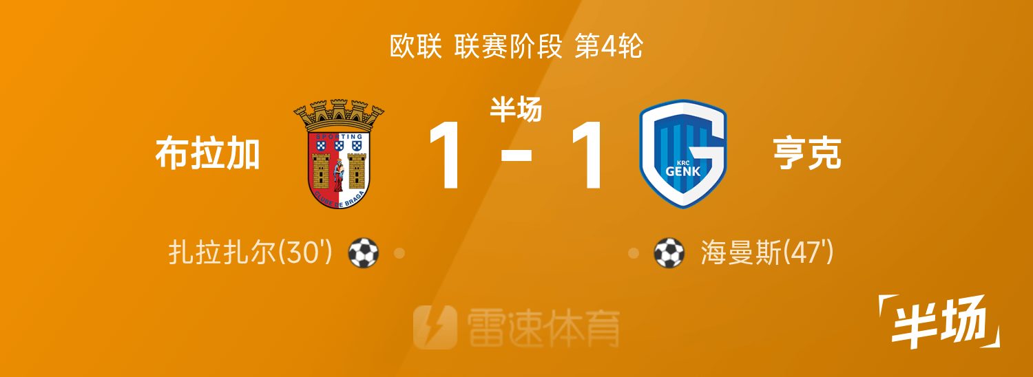 6686体育平台11月07日讯 25/26赛季欧联联赛事阶段第4轮,布拉加迎战亨克。半场战罢,双方赛果分暂为布拉加1-1亨克,扎拉扎尔、海曼斯破门建功。