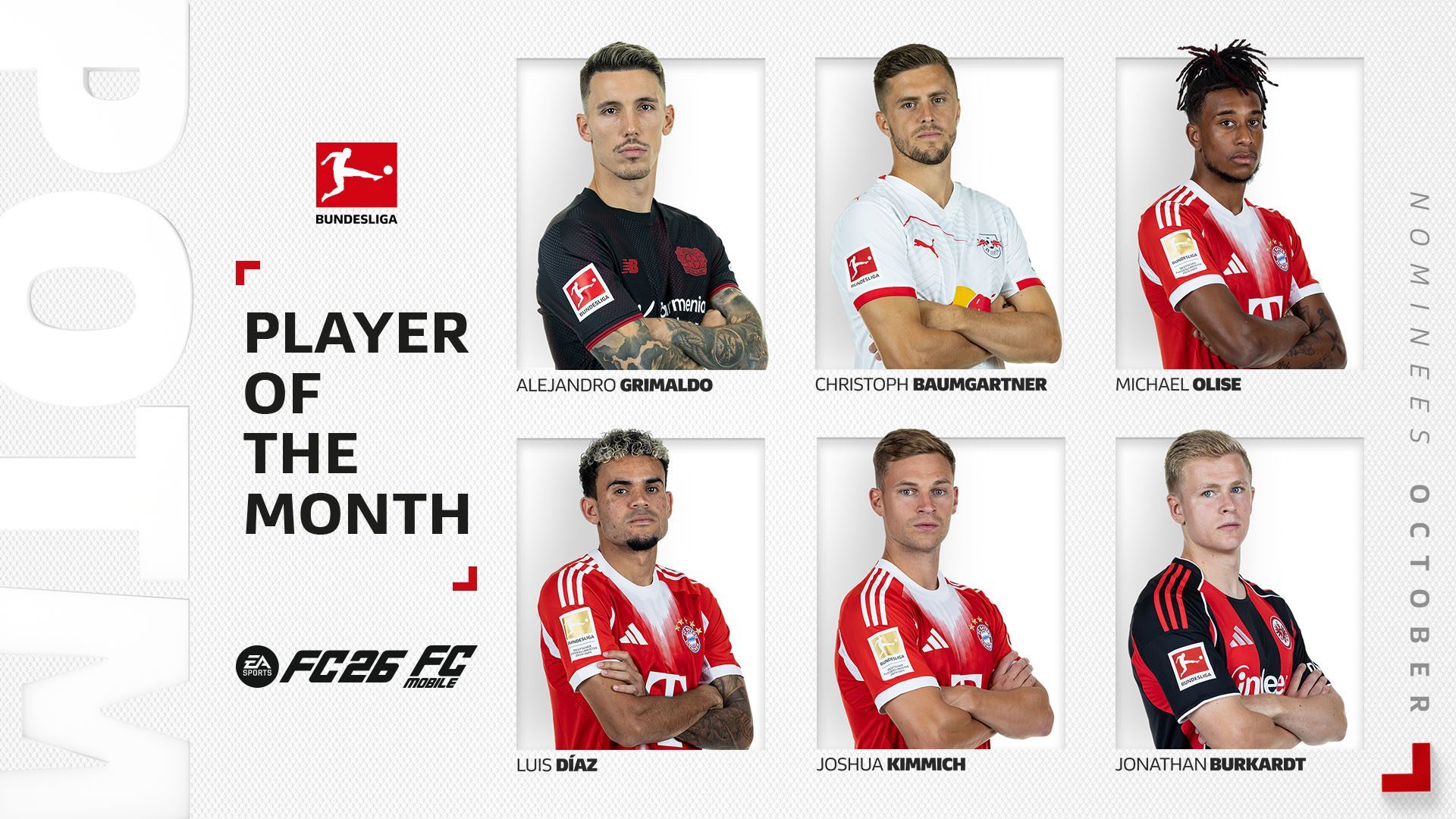 6686体育平台11月7日讯 德甲官方公布了十月份联赛事最佳球员,法兰克福前锋伯克特力压拜仁前锋迪亚斯和药厂队长格里马尔多当选。